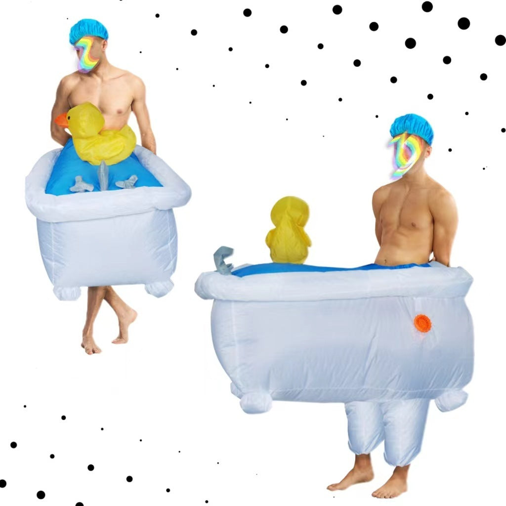 This Funny Bathtub Duck Inflatable Costume is a hilarious and unique outfit perfect for a Dance Party or any festive event. Designed to look like a person inside a bathtub being held by a duck, the costume is made from lightweight 190T polyester using durable Sewing craft. It comes in an average size suitable for adults and guarantees a memorable entrance.