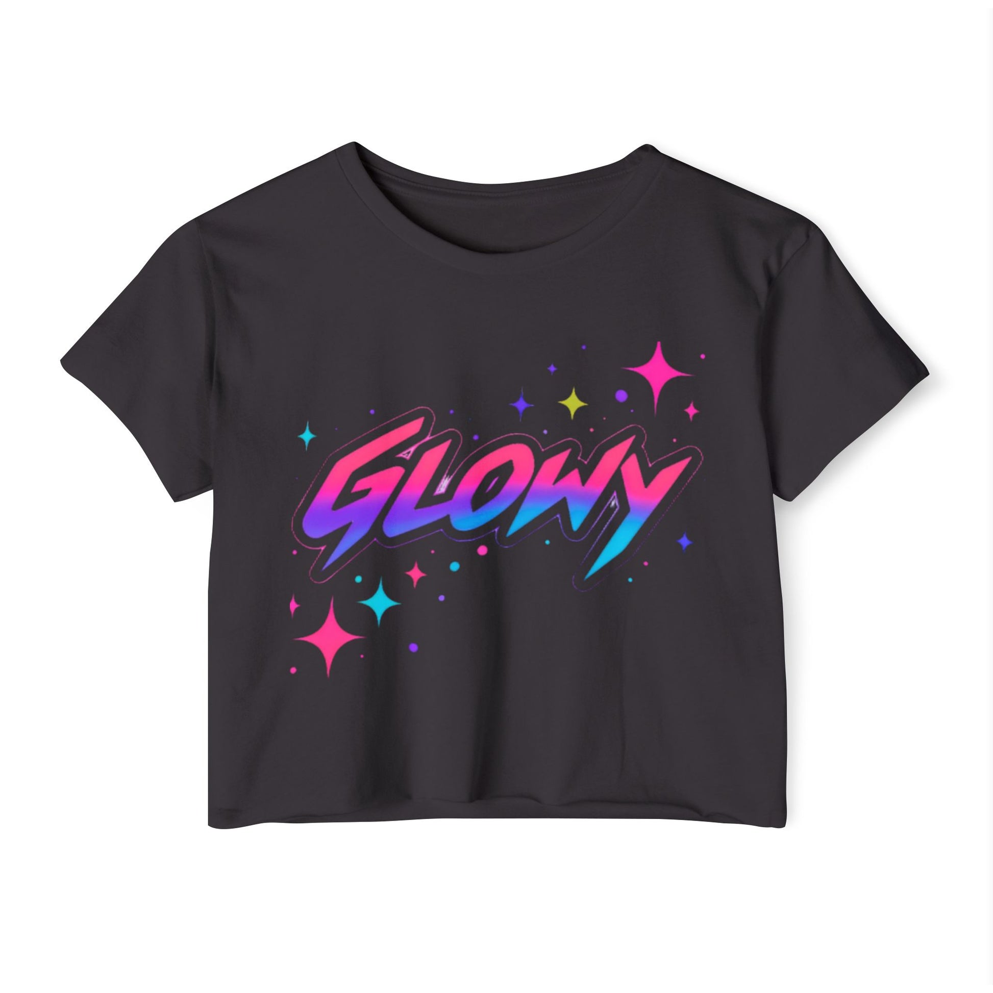 This lightweight crop top brings playful, neon energy to festival nights and late-summer hangs. The scoop neck and relaxed, modest cut let you move and dance without fuss, while raw sleeve and bottom hems give it an easy, lived-in vibe. Printed with a bold, retro “GLOWY” graphic and scattered starbursts in pinks, blues, and neons, it catches lights and compliments under stage strobes or string bulbs. The fabric a soft blend of polyester and combed ring-spun cotton