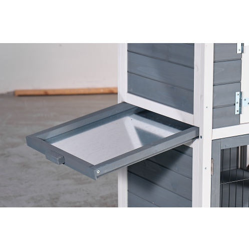 The Large Outdoor Chicken Coop Cage & Rabbit Hutch offers a stylish, durable, and comfortable home for your small pets. Built with high-quality wood, this 2-story design provides both shelter and open-air space for chickens, rabbits, or other small animals. Its weatherproof asphalt roof, pull-out no-leak tray, and galvanized wire mesh ensure excellent ventilation, easy cleaning, and year-round protection. The beautiful grey-blue and white finish blends seamlessly with any backyard or indoor space, combining function with style.