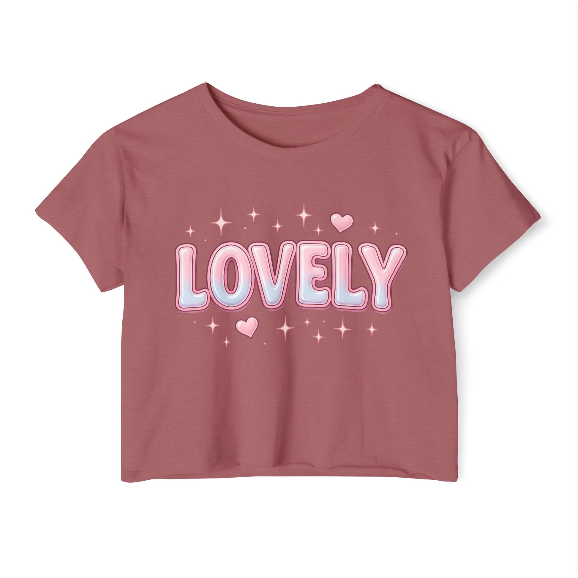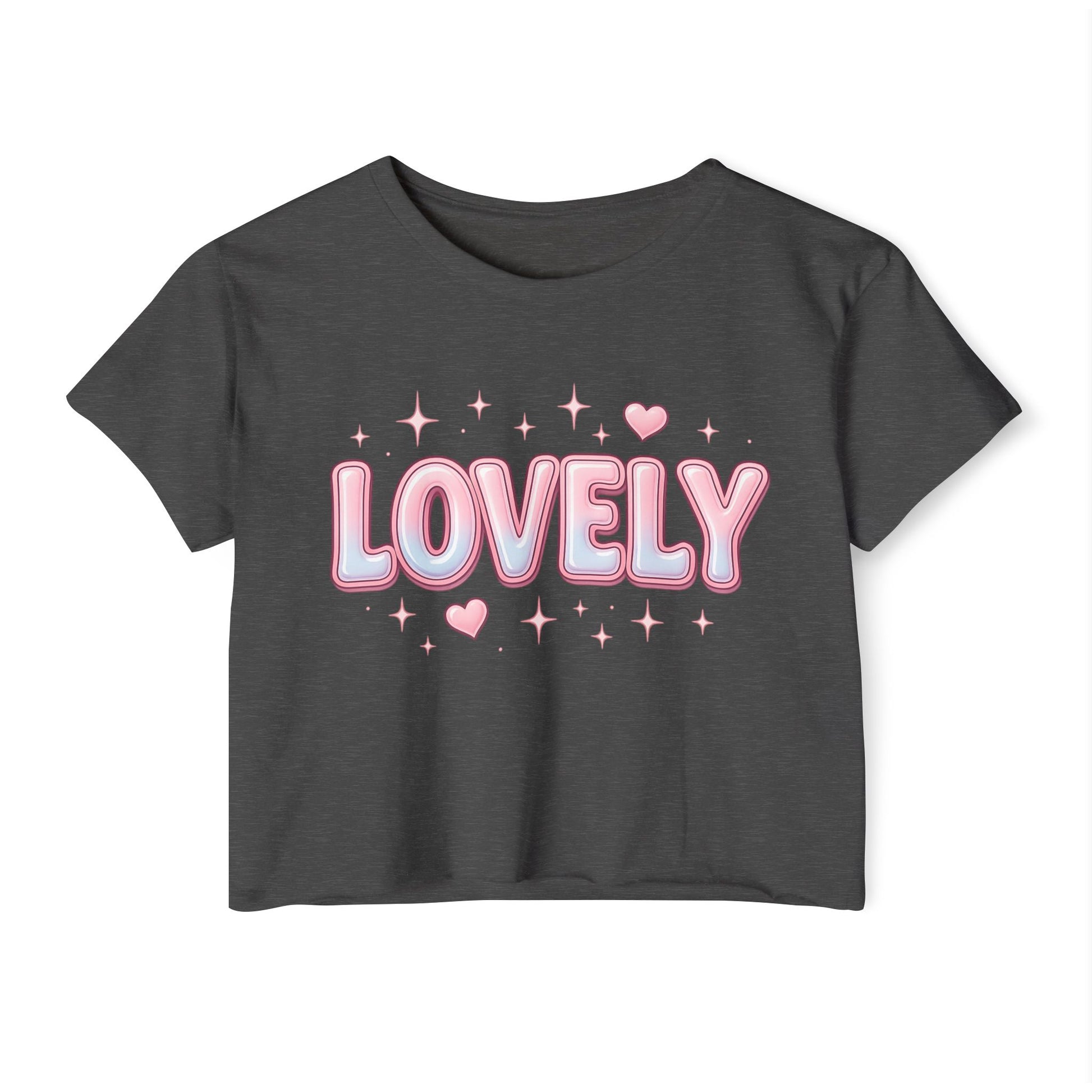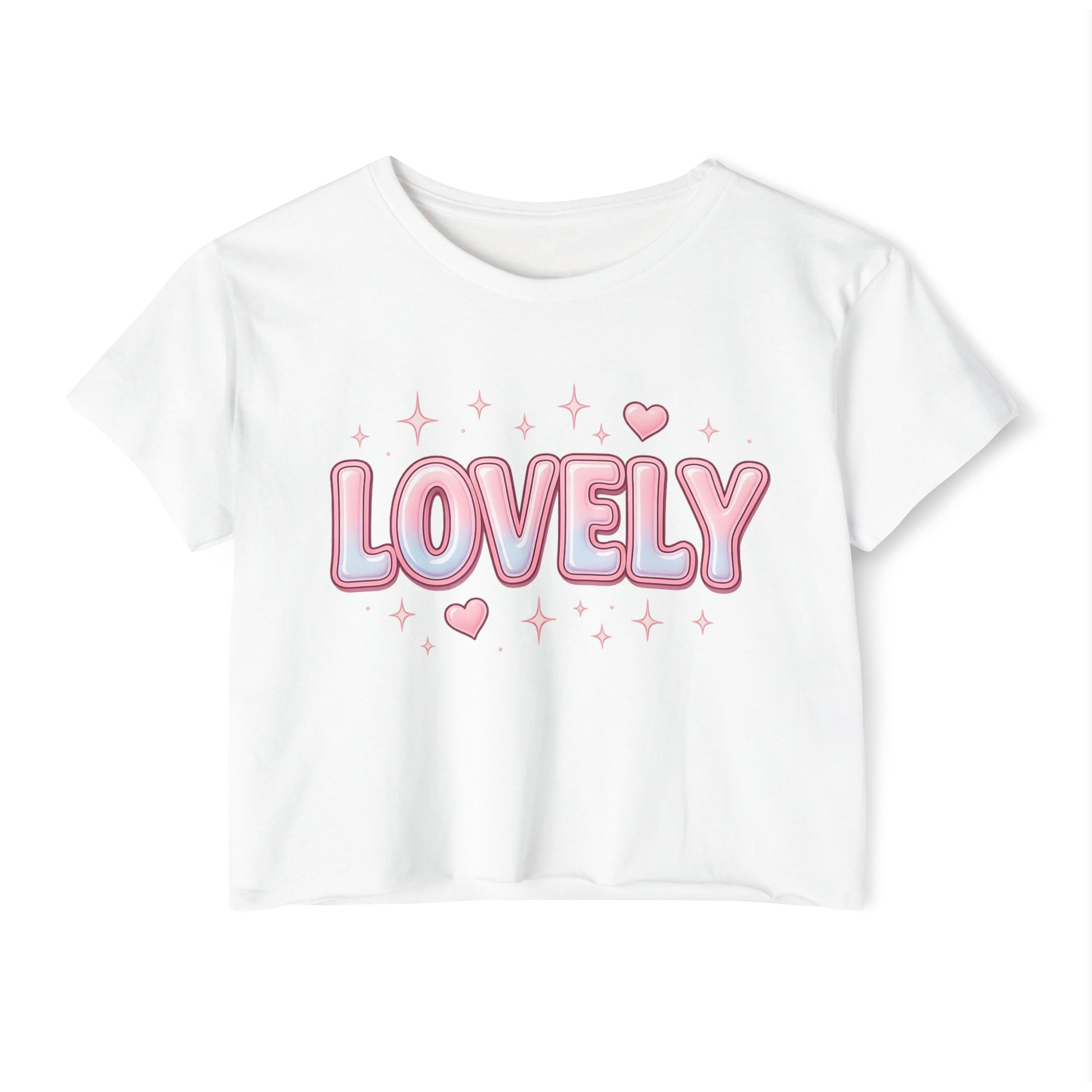 Light, flirty, and unapologetically sweet this crop top wears a bubblegum-pink “LOVELY” across the chest with tiny hearts and twinkling stars. The scoop neckline and relaxed, modest cut keep the look casual and wearable, while the raw hemline and extra-light fabric read like a sunlit weekend: easy, breezy, and a little playful. It layers under an oversized jacket or pairs with high-waist denim for festival days, coffee runs, or lazy afternoons when you want to send out soft, confident vibes without trying too hard.