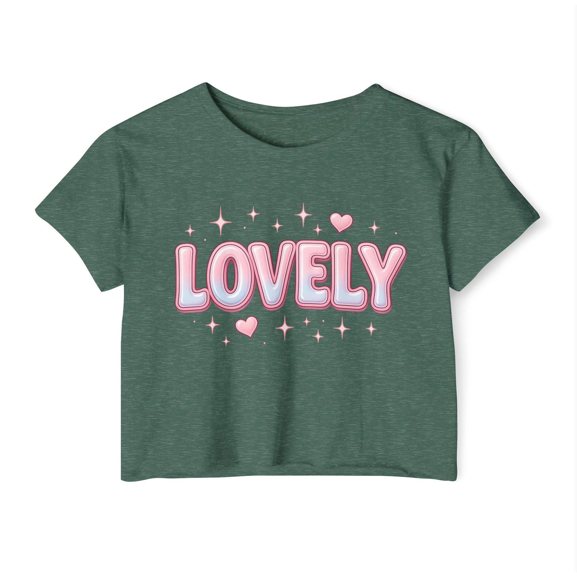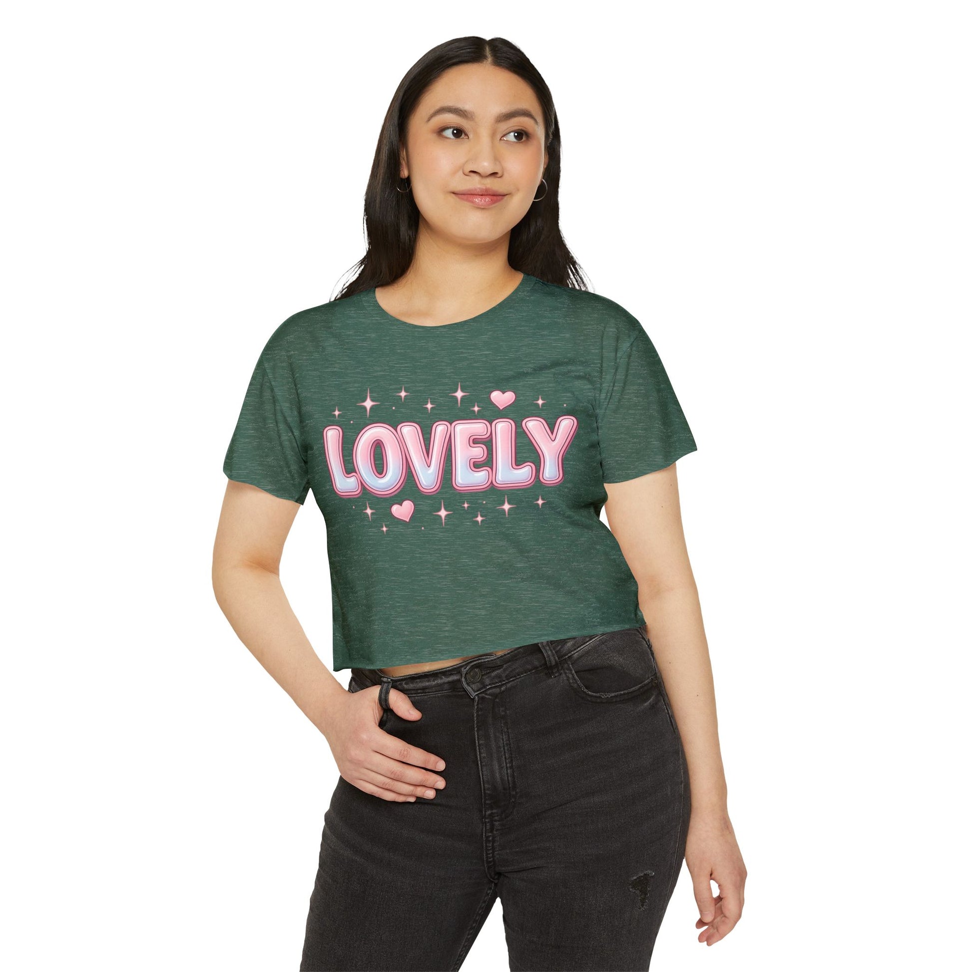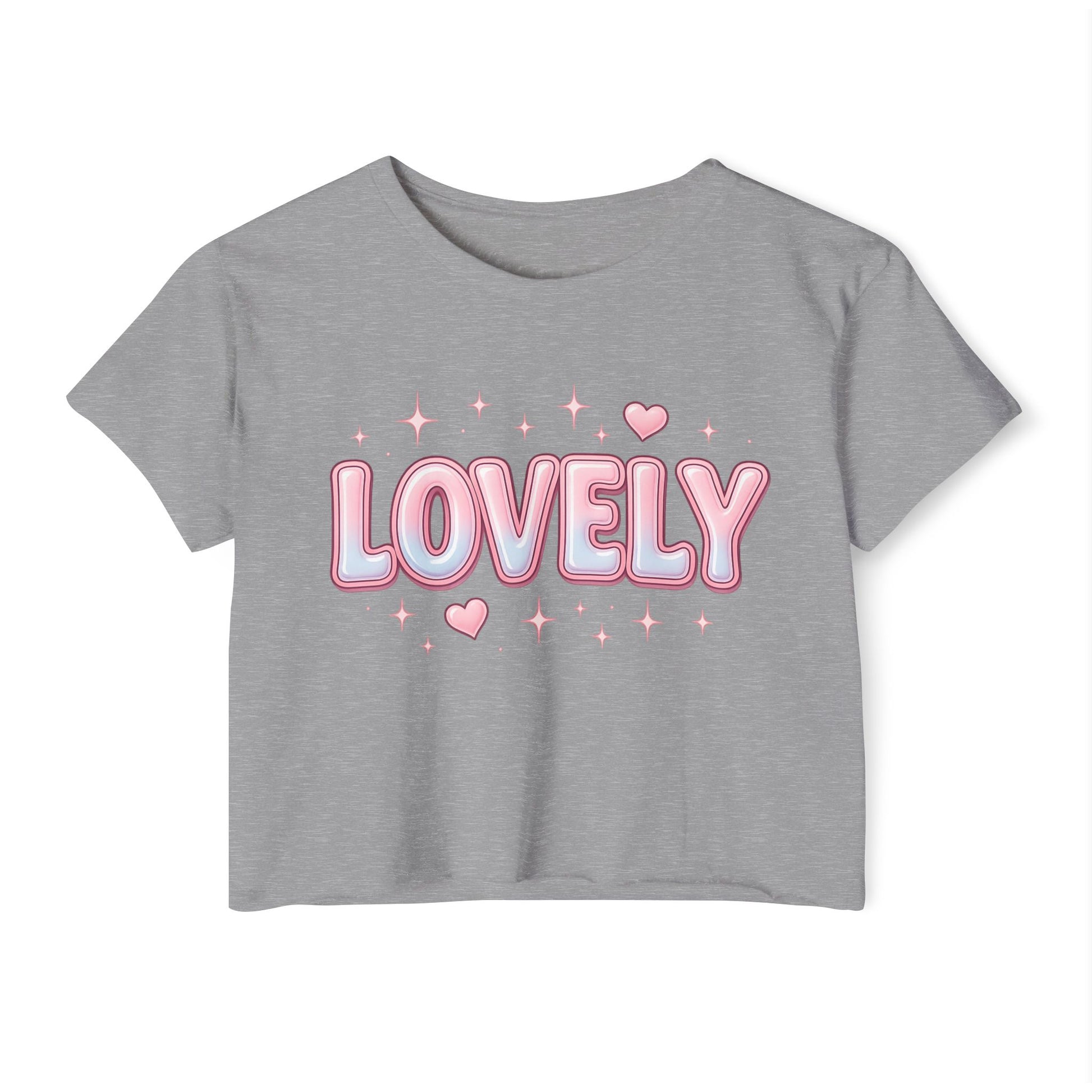 Light, flirty, and unapologetically sweet this crop top wears a bubblegum-pink “LOVELY” across the chest with tiny hearts and twinkling stars. The scoop neckline and relaxed, modest cut keep the look casual and wearable, while the raw hemline and extra-light fabric read like a sunlit weekend: easy, breezy, and a little playful. It layers under an oversized jacket or pairs with high-waist denim for festival days, coffee runs, or lazy afternoons when you want to send out soft, confident vibes without trying too hard.