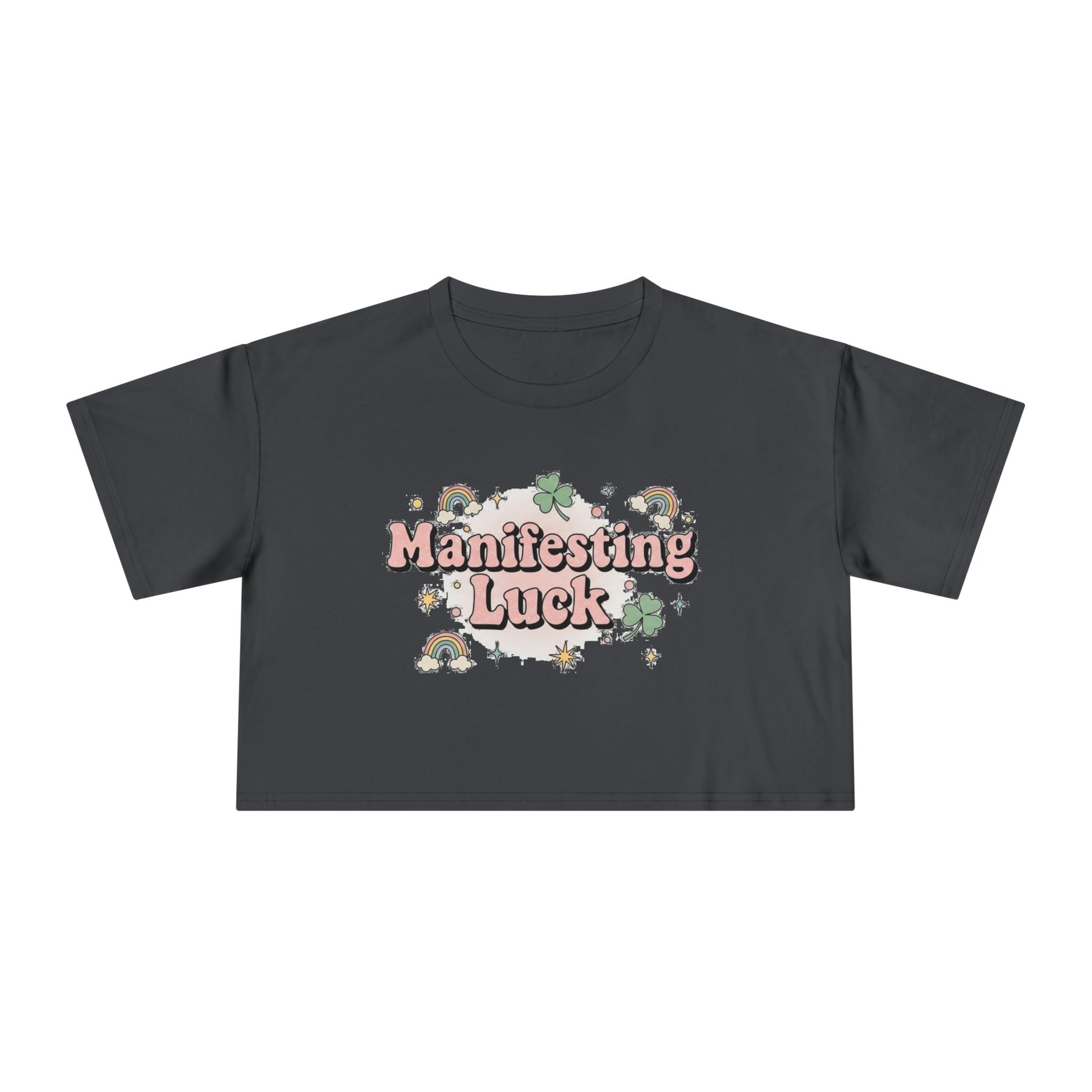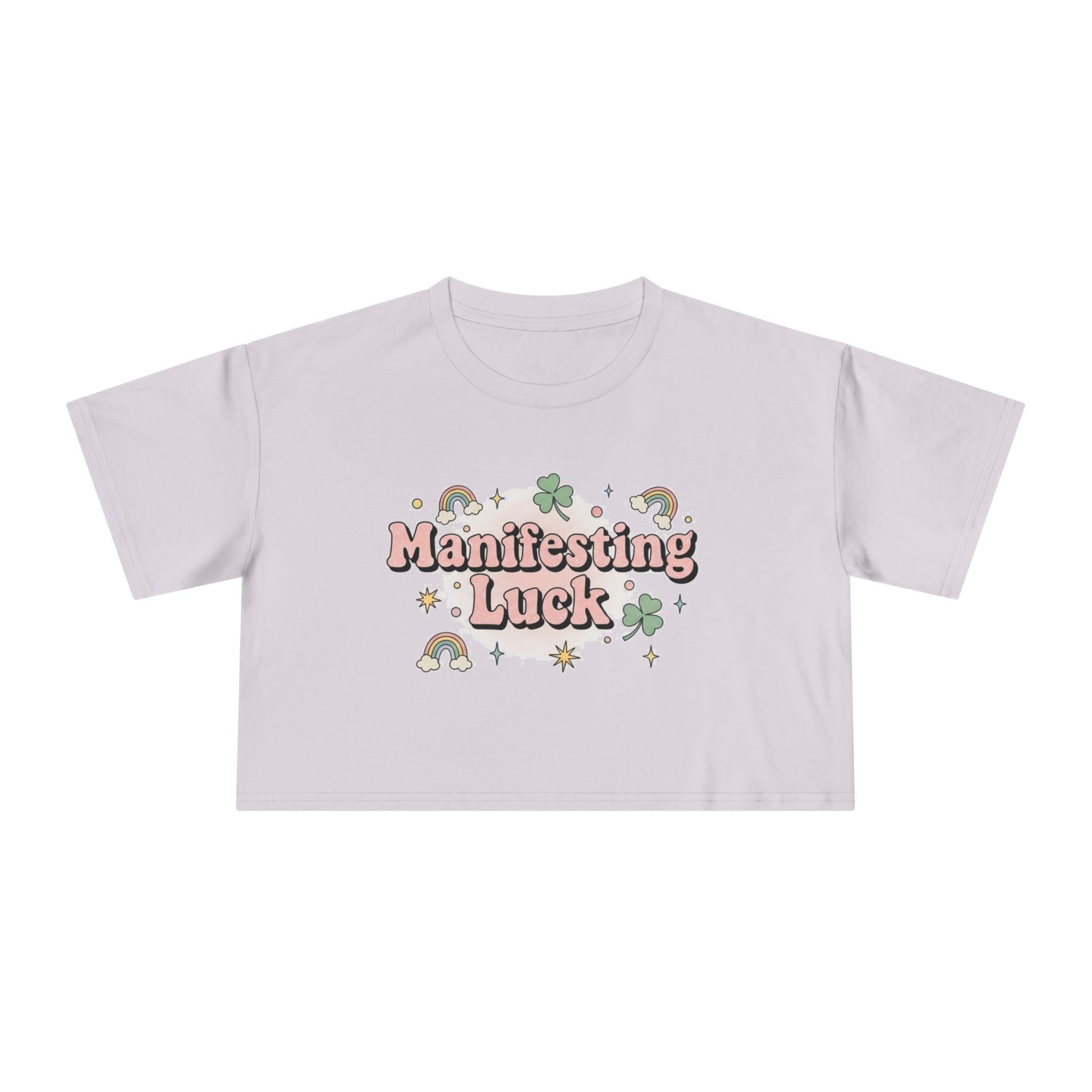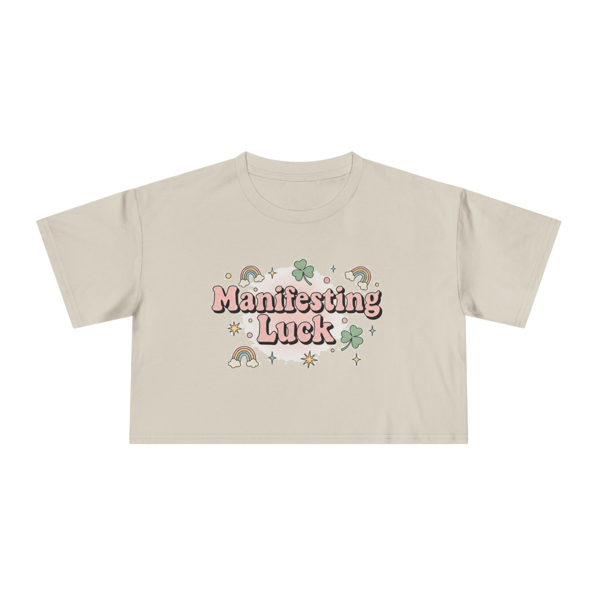 This relaxed crop tee brings a playful, hopeful vibe to casual days. Soft, medium-weight cotton and a boxy, dropped-shoulder cut create an airy, lived-in feel that layers easily over high-waist jeans or a slip dress. The cheerful “Manifesting Luck” design. Complete with tiny rainbows, clovers, and stars reads like a quiet charm you can wear: a small ritual to boost confidence before brunch, market runs, or creative sessions. It’s breathable, simple to care for, and crafted with reinforced seams so the silhouette keeps its shape through repeated wears. Put it on when you want your outfit to feel like a gentle nudge toward good days and small wins.