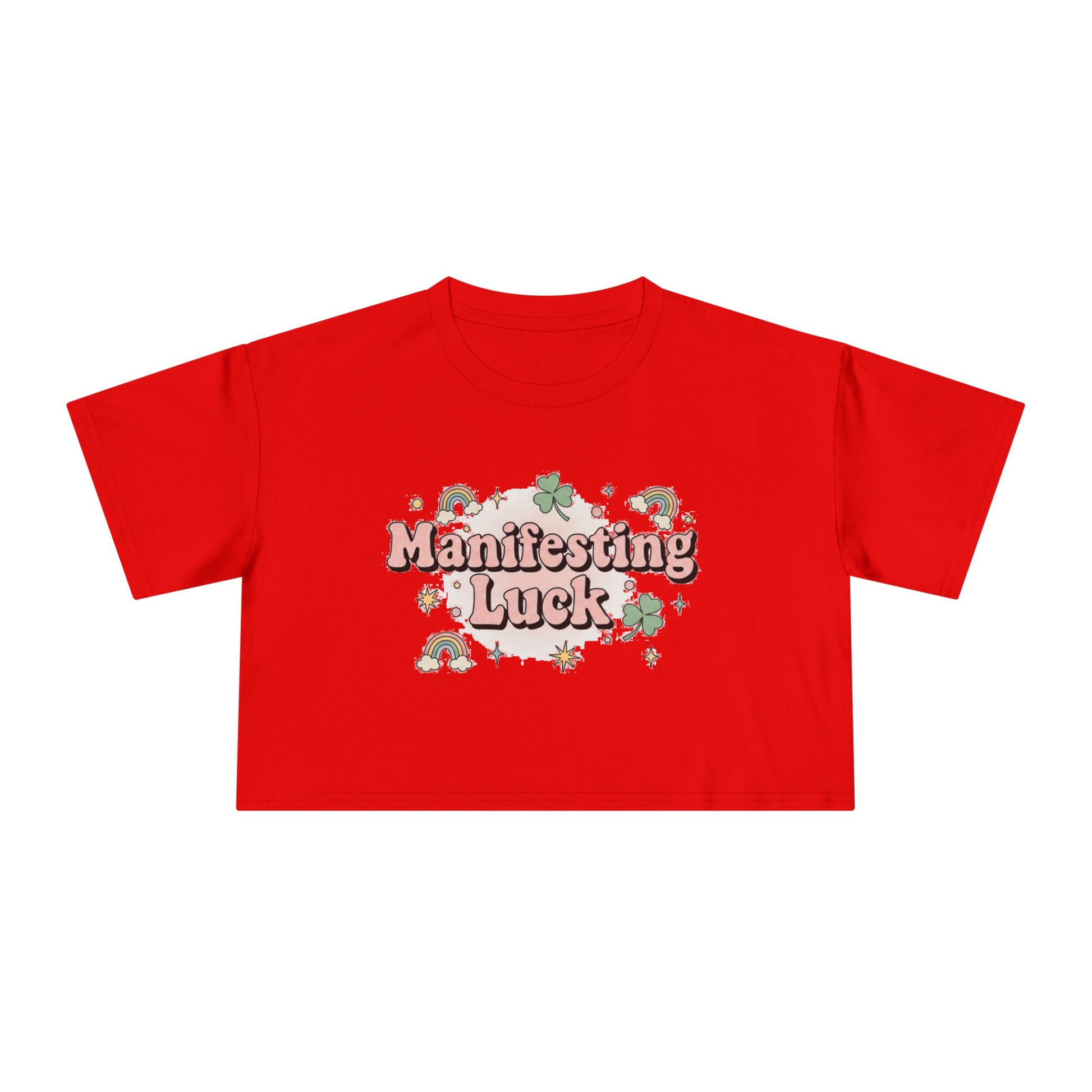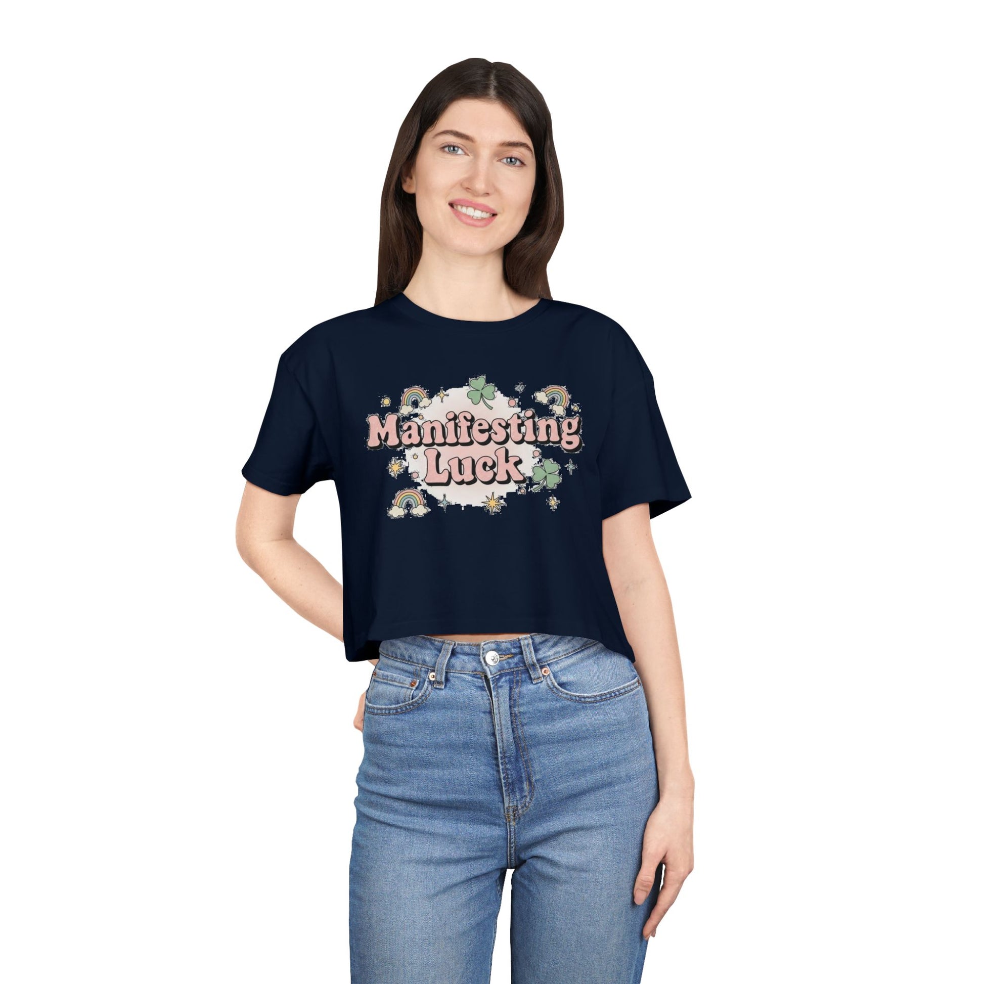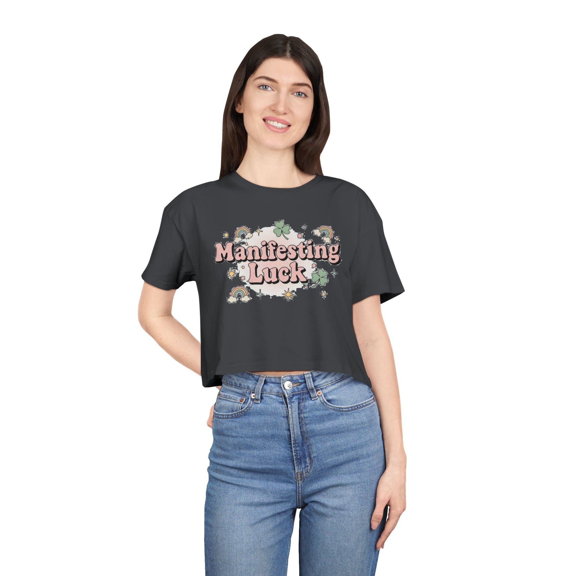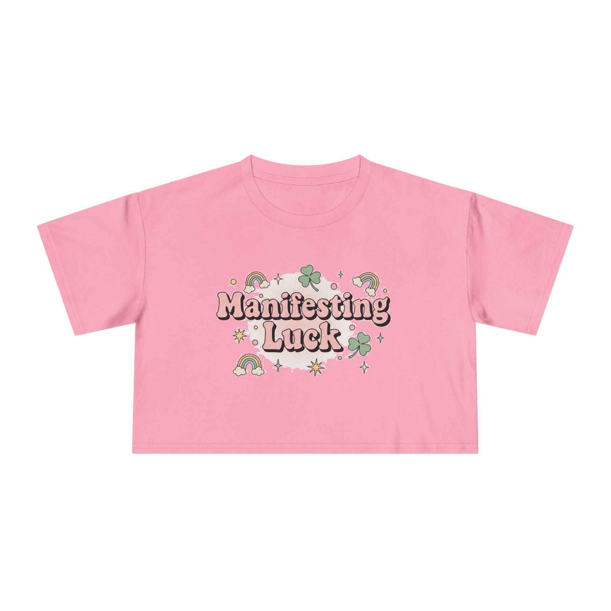 This relaxed crop tee brings a playful, hopeful vibe to casual days. Soft, medium-weight cotton and a boxy, dropped-shoulder cut create an airy, lived-in feel that layers easily over high-waist jeans or a slip dress. The cheerful “Manifesting Luck” design. Complete with tiny rainbows, clovers, and stars reads like a quiet charm you can wear: a small ritual to boost confidence before brunch, market runs, or creative sessions. It’s breathable, simple to care for, and crafted with reinforced seams so the silhouette keeps its shape through repeated wears. Put it on when you want your outfit to feel like a gentle nudge toward good days and small wins.