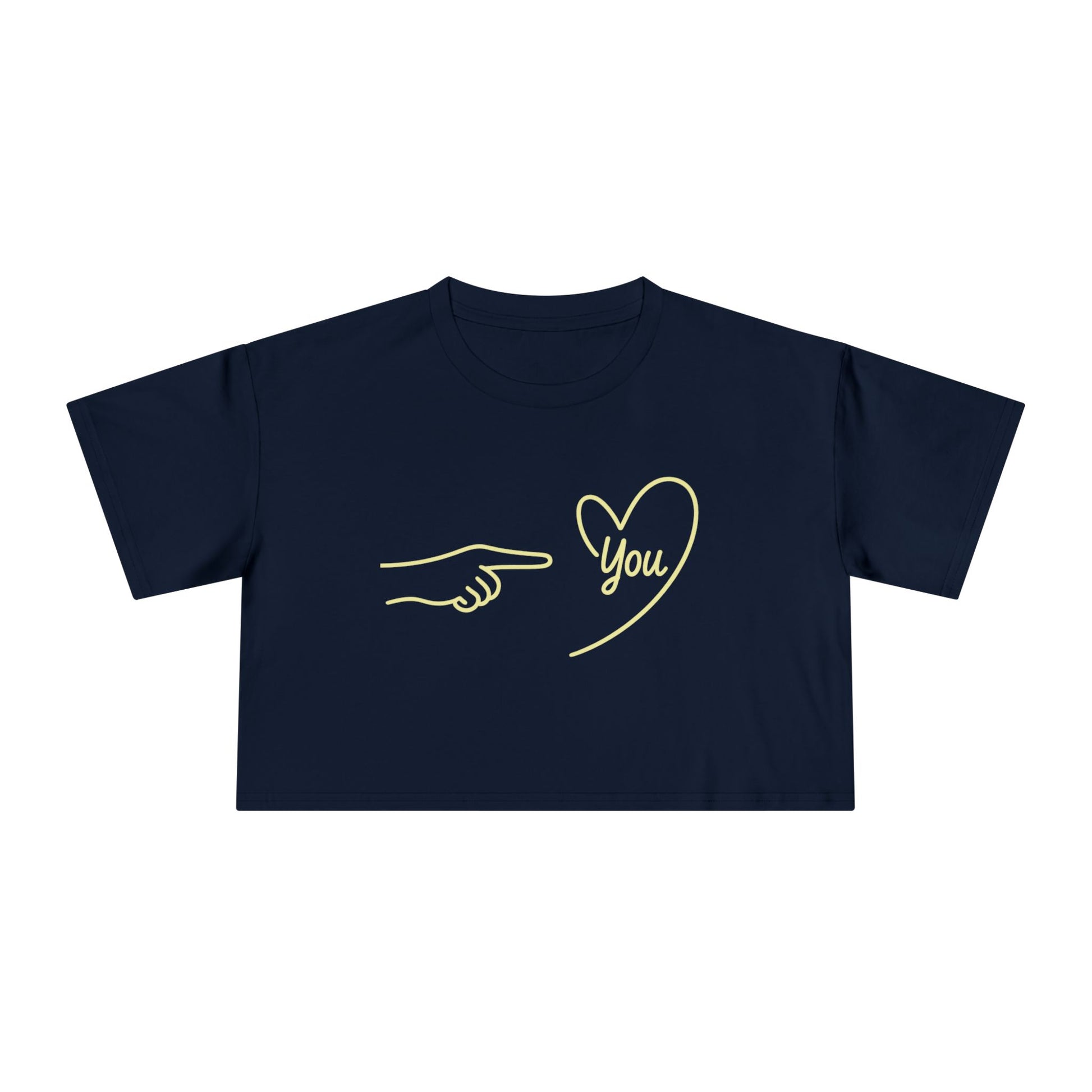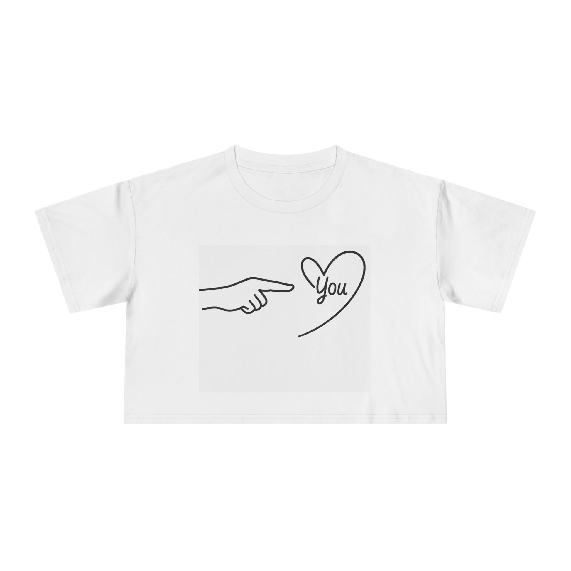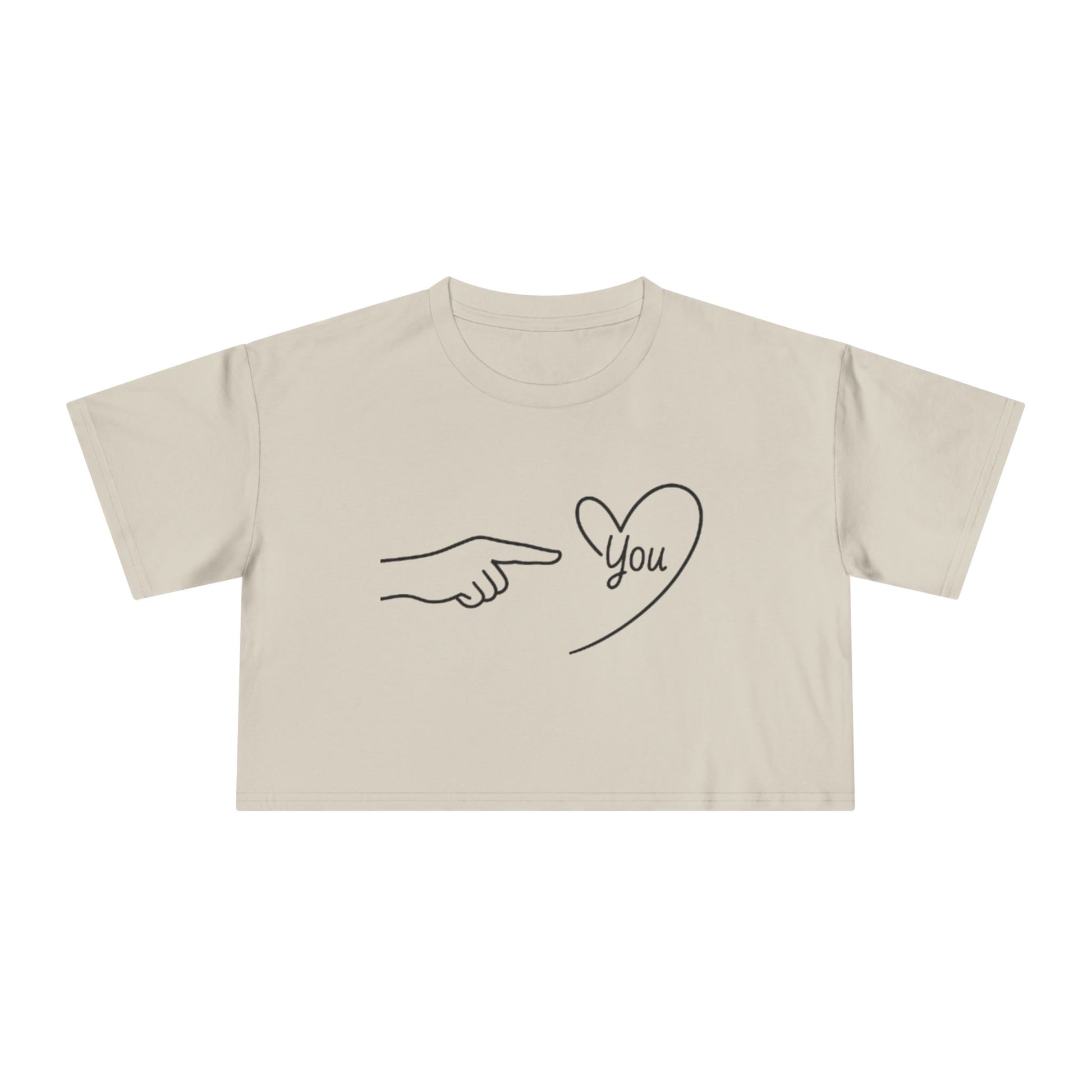 Light, casual, and quietly expressive this cropped tee carries a simple line-drawn graphic of a pointing hand and a heart that whispers “you.” The relaxed, dropped-shoulder cut and medium-weight cotton give it a lived-in feel that layers easily over high-waisted jeans or a slip dress. Wear it on slow coffee mornings, long walks through the neighborhood, or when you want to send a small, tender message without saying a word. The sewn-in label and reinforced shoulder tape keep the shape soft but stable, while the double-stitched seams promise everyday durability. It’s the kind of shirt that reads like a note left on the fridge: straightforward, warm, and a little bit playful.