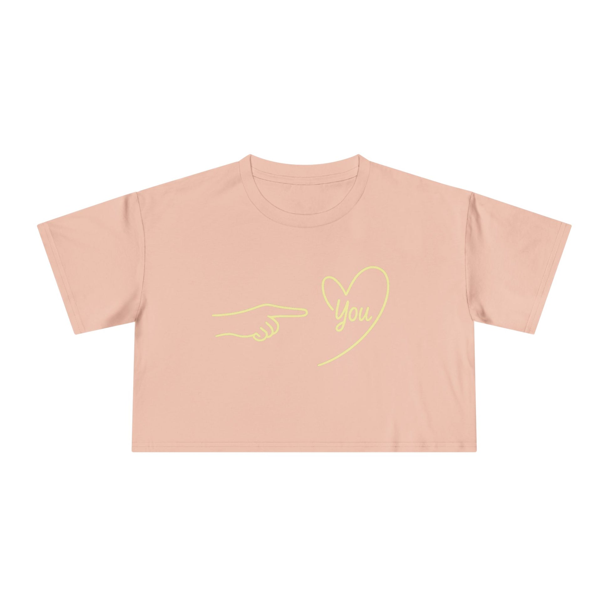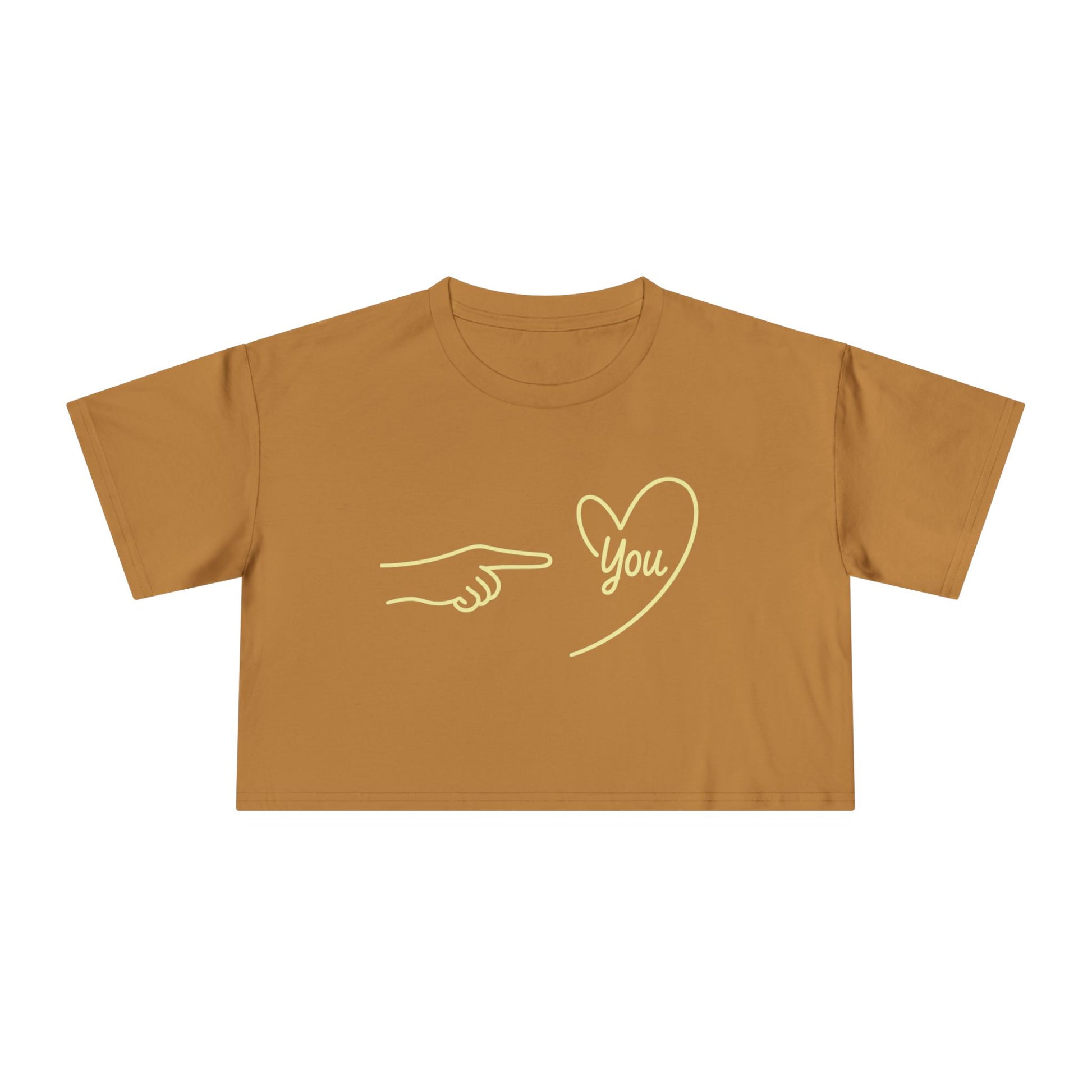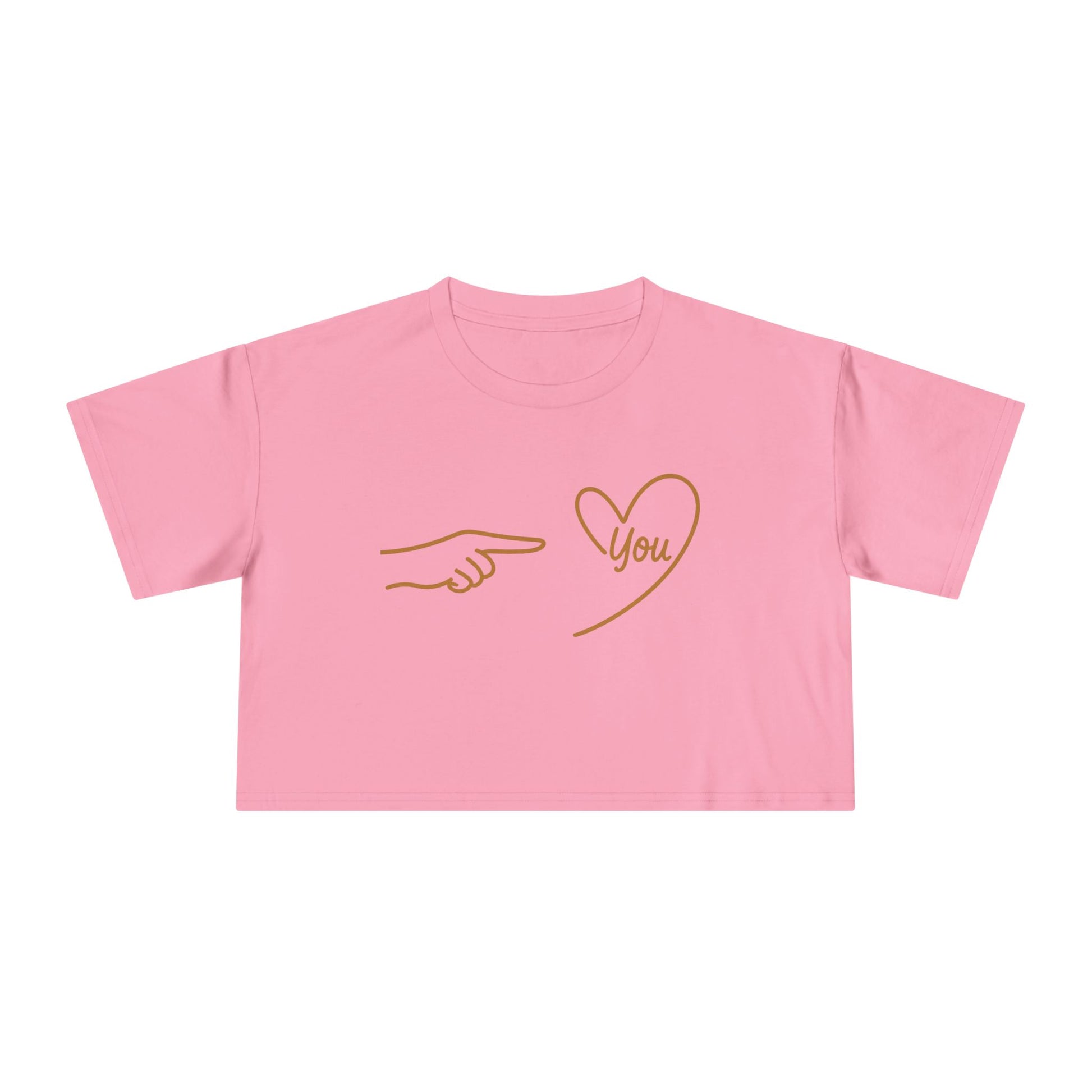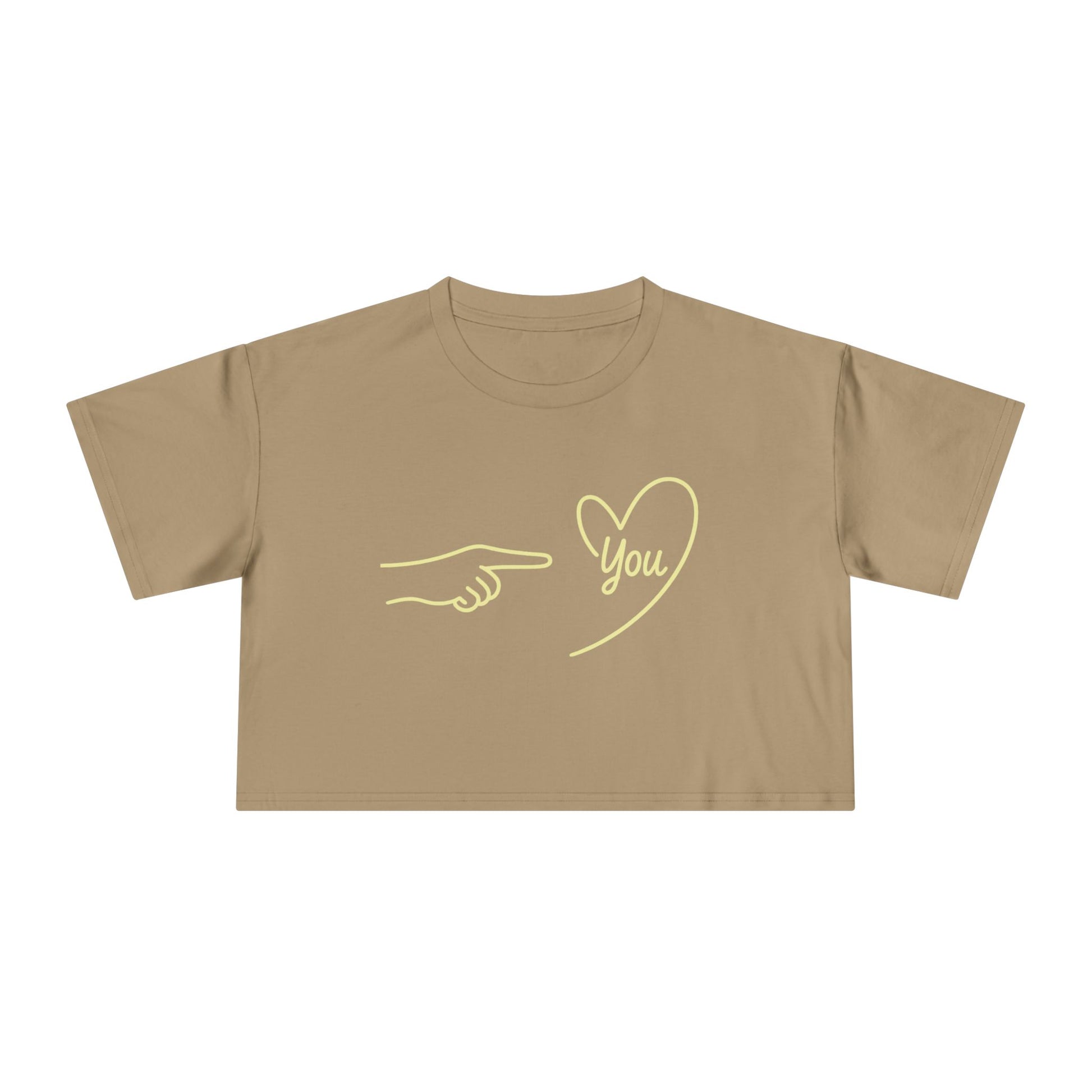 Light, casual, and quietly expressive this cropped tee carries a simple line-drawn graphic of a pointing hand and a heart that whispers “you.” The relaxed, dropped-shoulder cut and medium-weight cotton give it a lived-in feel that layers easily over high-waisted jeans or a slip dress. Wear it on slow coffee mornings, long walks through the neighborhood, or when you want to send a small, tender message without saying a word. The sewn-in label and reinforced shoulder tape keep the shape soft but stable, while the double-stitched seams promise everyday durability. It’s the kind of shirt that reads like a note left on the fridge: straightforward, warm, and a little bit playful.