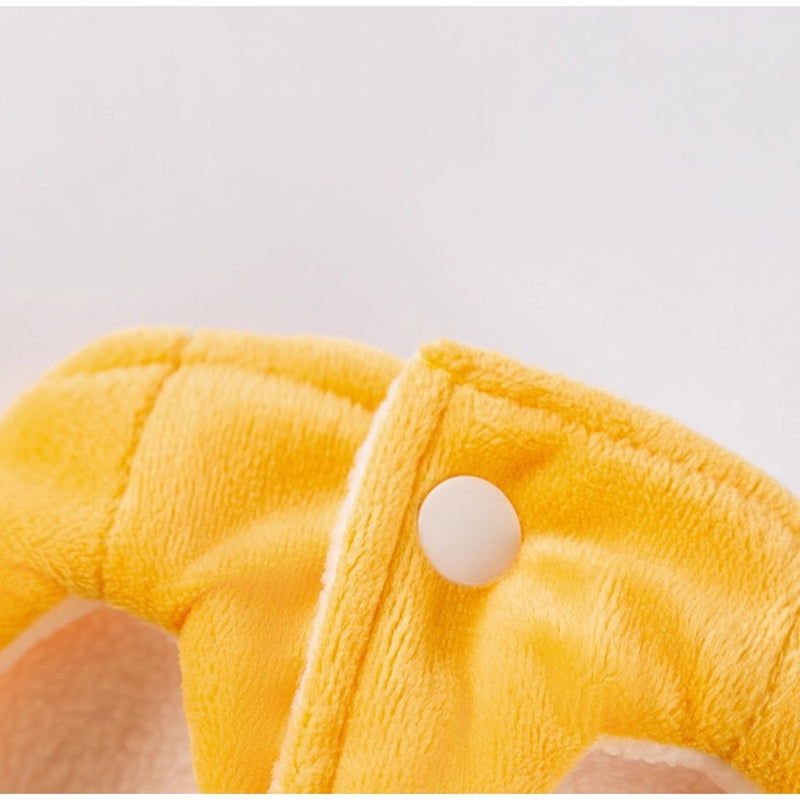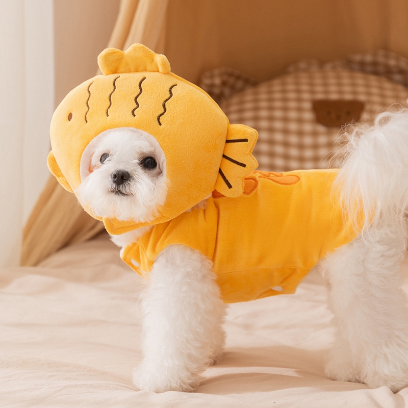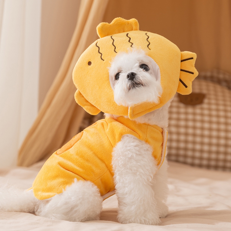 Designed for autumn and winter, this cozy cotton-padded suit includes a bright yellow fish-shaped hat paired with a matching vest, creating a hilarious and heart-melting transformation for your dog. The soft, warm fabric ensures all-day comfort, while the integrated leash ring makes outdoor walks both easy and practical. Perfect for themed events, photoshoots, casual outings, or simply showing off your dog’s playful personality, this costume is a must-have for pet parents who love creative and stylish outfits.