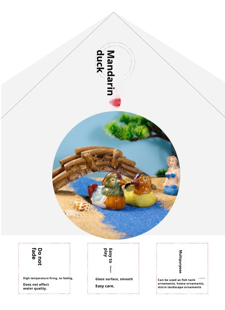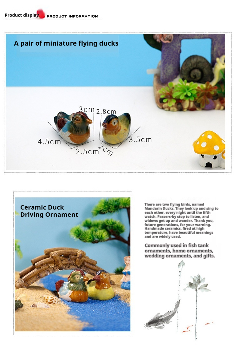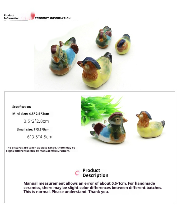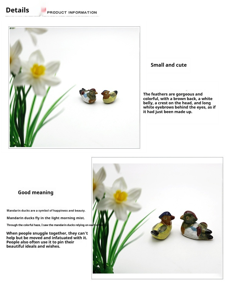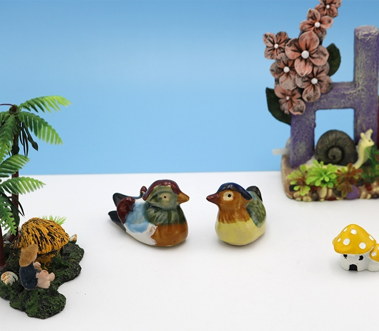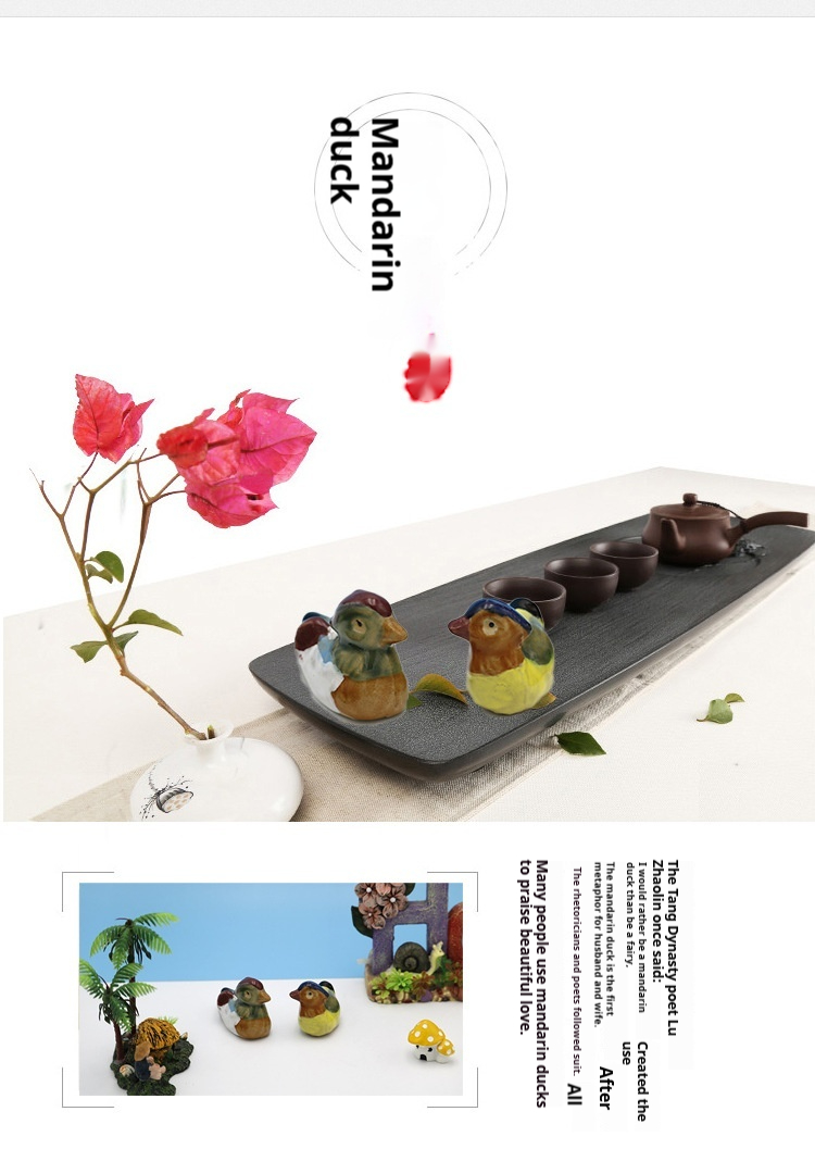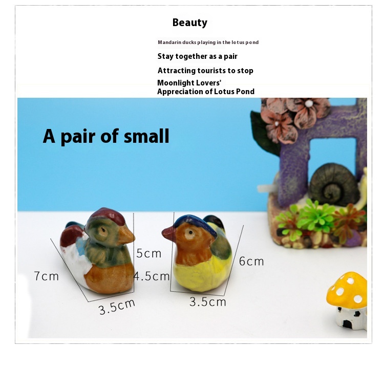 These charming Ceramic Mandarin Duck ornaments are perfect for creating or accenting a Micro Landscape. Crafted from traditional Clay with a retro simple style, these pieces function as simple Ornament embellish[ments]. They come as a traditional pair and are available in two small sizes.