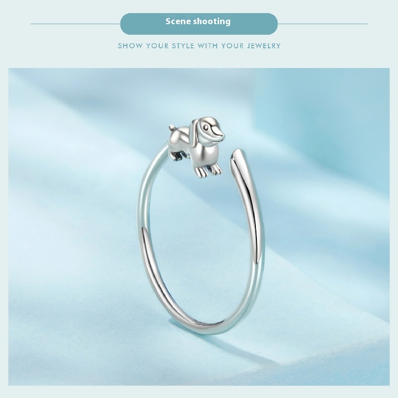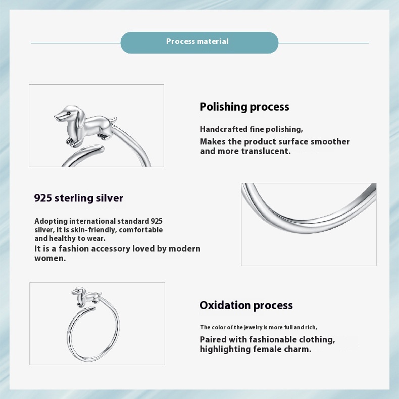 The Cute Animal S925 Sterling Silver Sausage Dog Open Ring is an elegant, playful accessory designed for women who adore pet-themed jewelry. Crafted from premium 92.5% sterling silver and finished with an oxidation process for enhanced depth and vintage charm, this adjustable ring features an adorable dachshund design that wraps beautifully around the finger. Lightweight, comfortable, and full of personality, it’s the perfect everyday piece or a thoughtful gift for any dog lover.